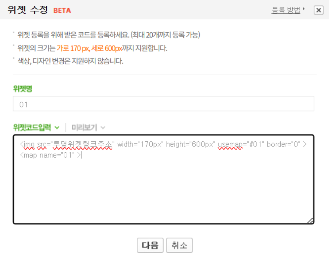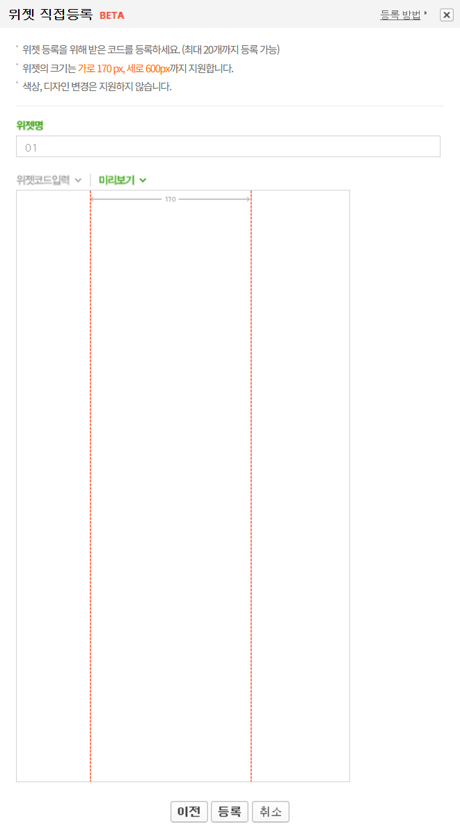 기둥은 +위젯직접등록BETA 버튼을 눌러 위젯명을 넣고 위젯코드입력란에 코드를 입력해 줍니다.