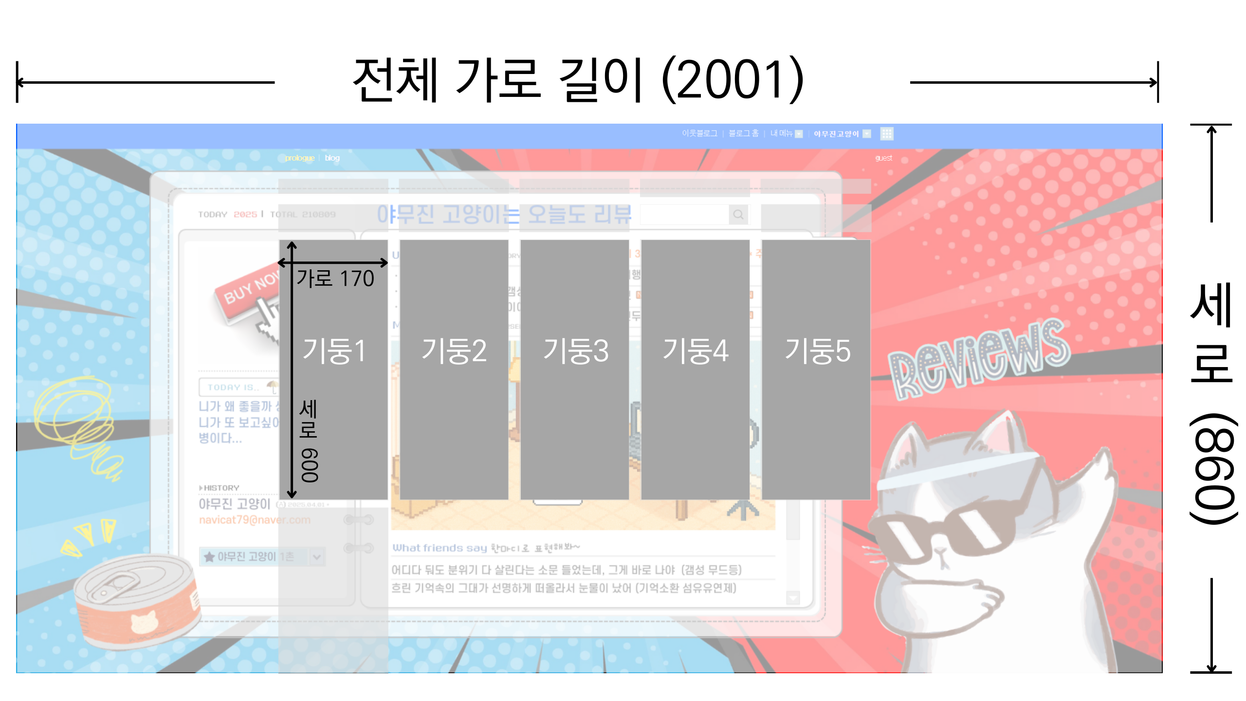 투명위젯기둥 하나의 사이즈는 가로170, 세로600으로 최대 5개가 들어가요.