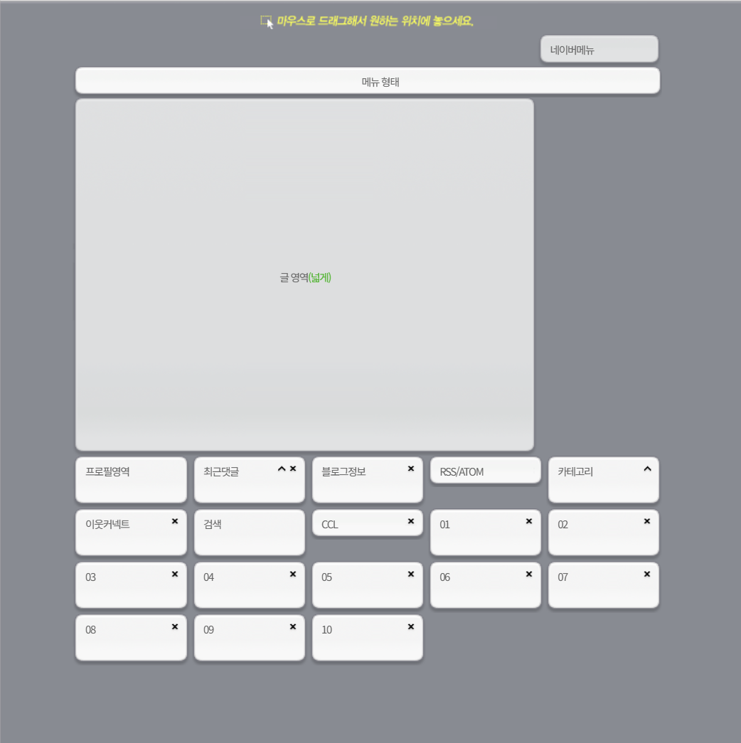 등록된 위젯은 글의 영역 아래에 배치가 되고, 아래에 배치된 위젯을 잡아서 위로 드래그 앤 드롭으로 올려놓아주면 스킨이 들어갈 공간이 확보됩니다.