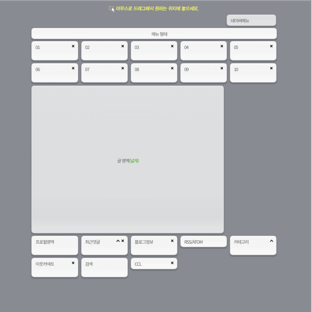 스킨 디자인에 따라 위젯의 갯수와 크기가 정해지는데요, 이 부분은 나중에 심도있게 다시 다뤄보기로 할께요.