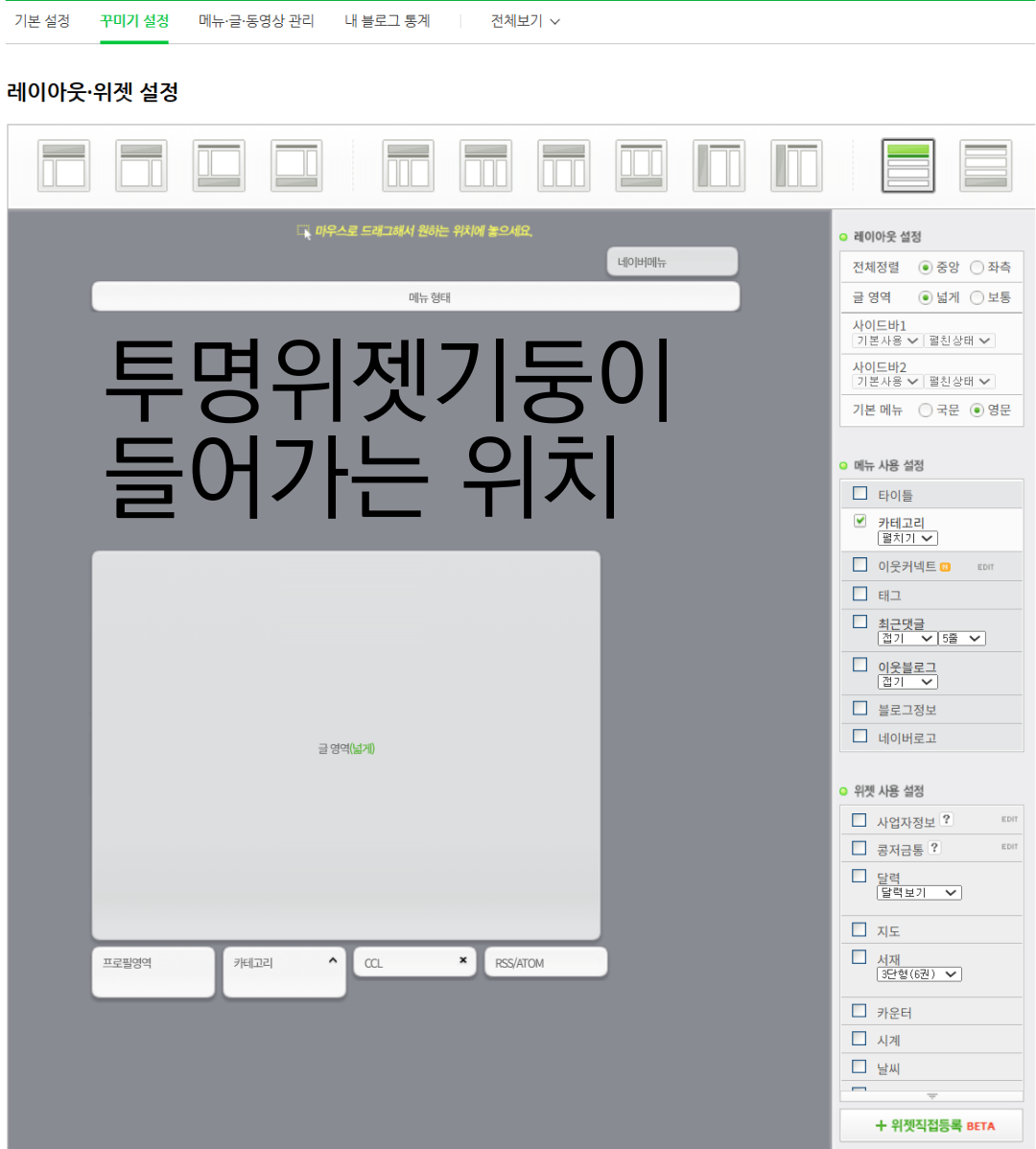 홈페이지형 스킨을 블로그에 적용시키려면 그 스킨이 알맞게 들어갈 수 있는 공간을 만들어 줘야해요.