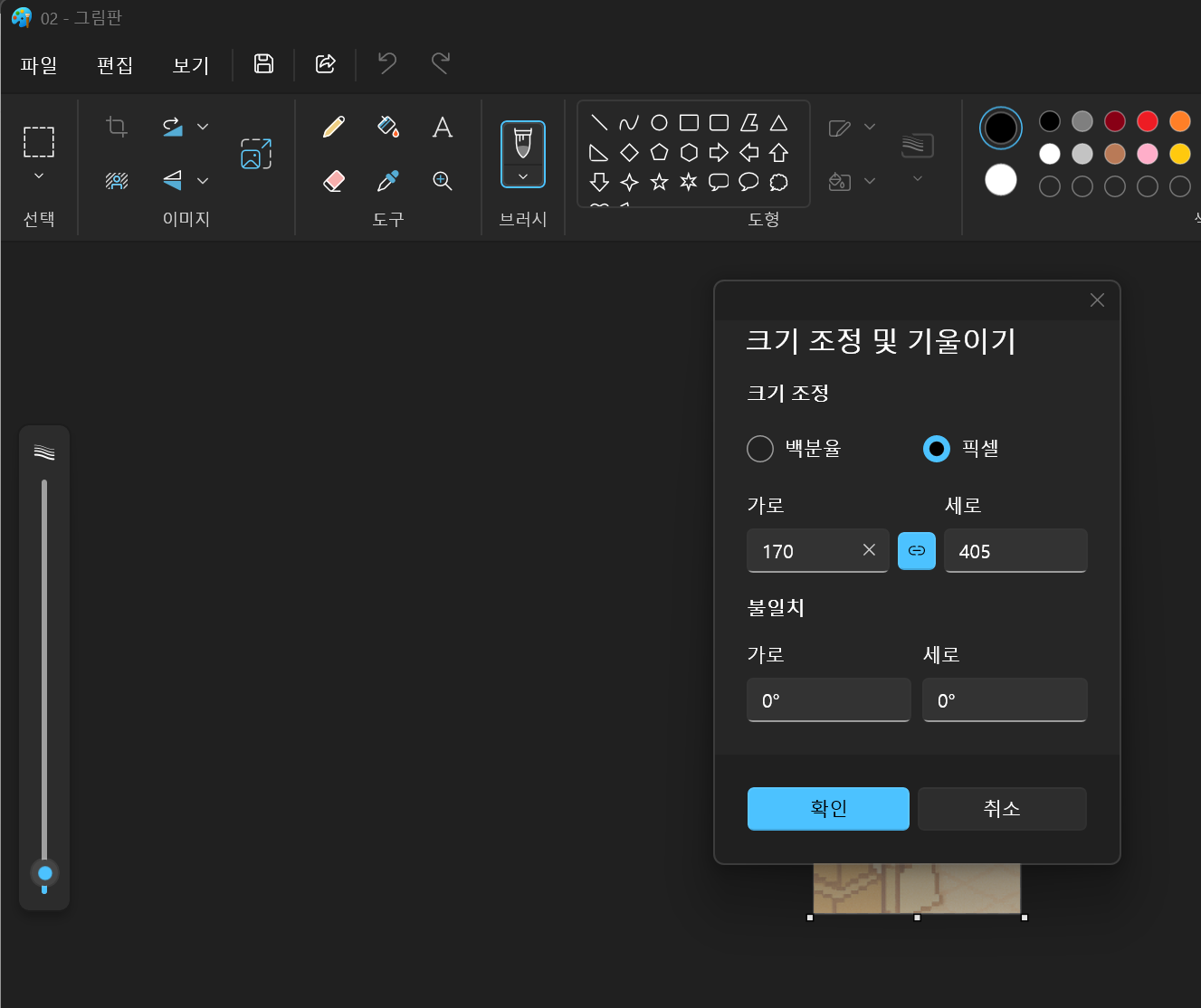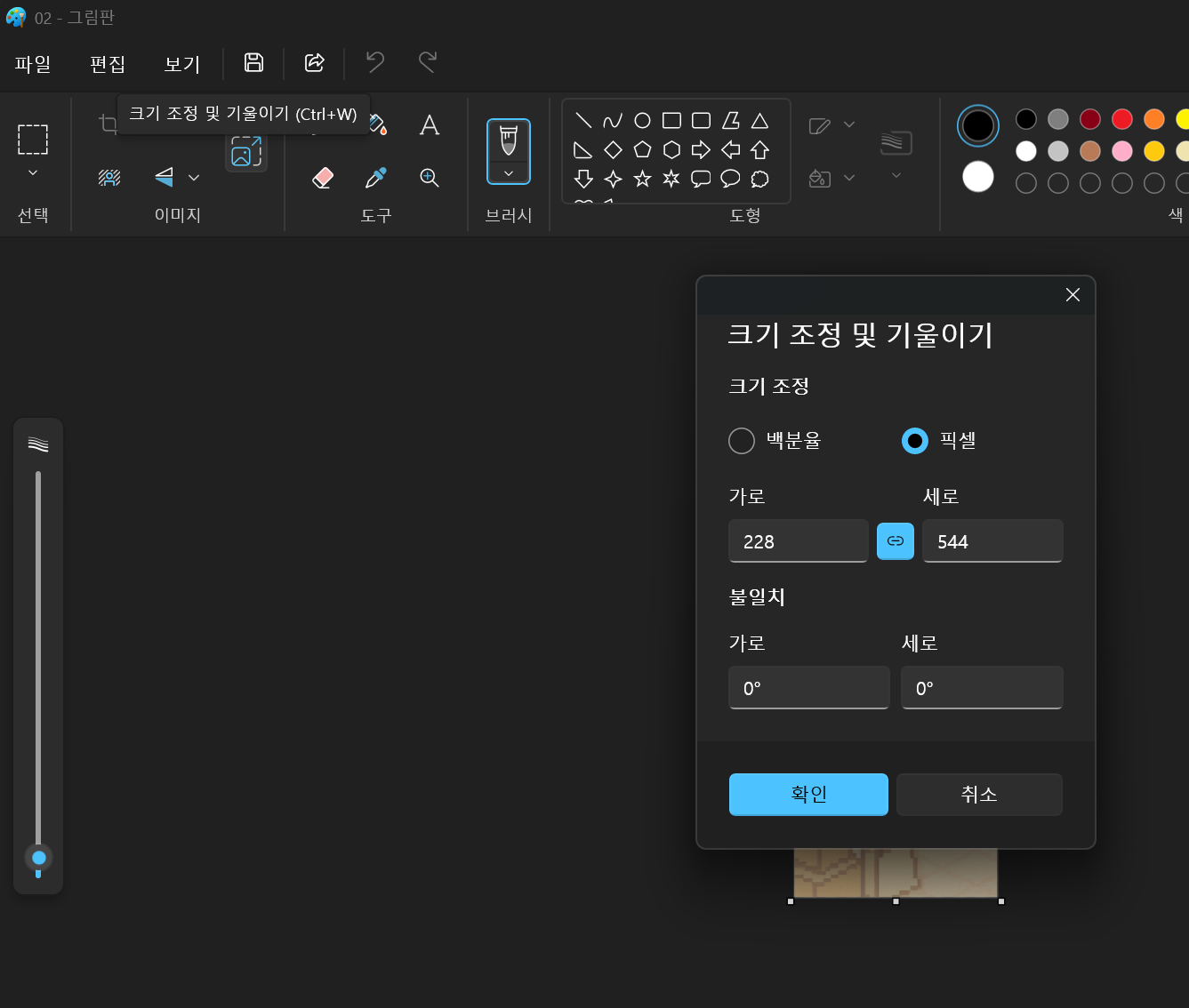 캡처한 이미지를 더블클릭하면 그림판에서 열릴건데요, 크기 조정 및 기울이기를 클릭하면 조정할 수 있는 창이 뜰거예요.