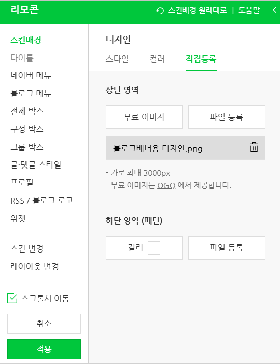 홈페이지형 네이버 블로그 스킨을 설정하기 위해서는 네이버 블로그 내 메뉴 -> 관리 -> 세부디자인설정 -> 리모콘 설정창에서 직접등록을 클릭하면 파일을 등록할 수가 있어요.