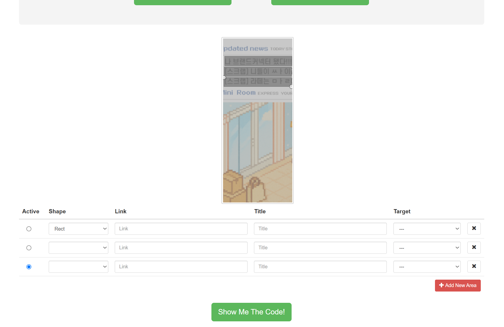 Easy free online html image map generator. Select an image, click to create your areas and generate html your output!